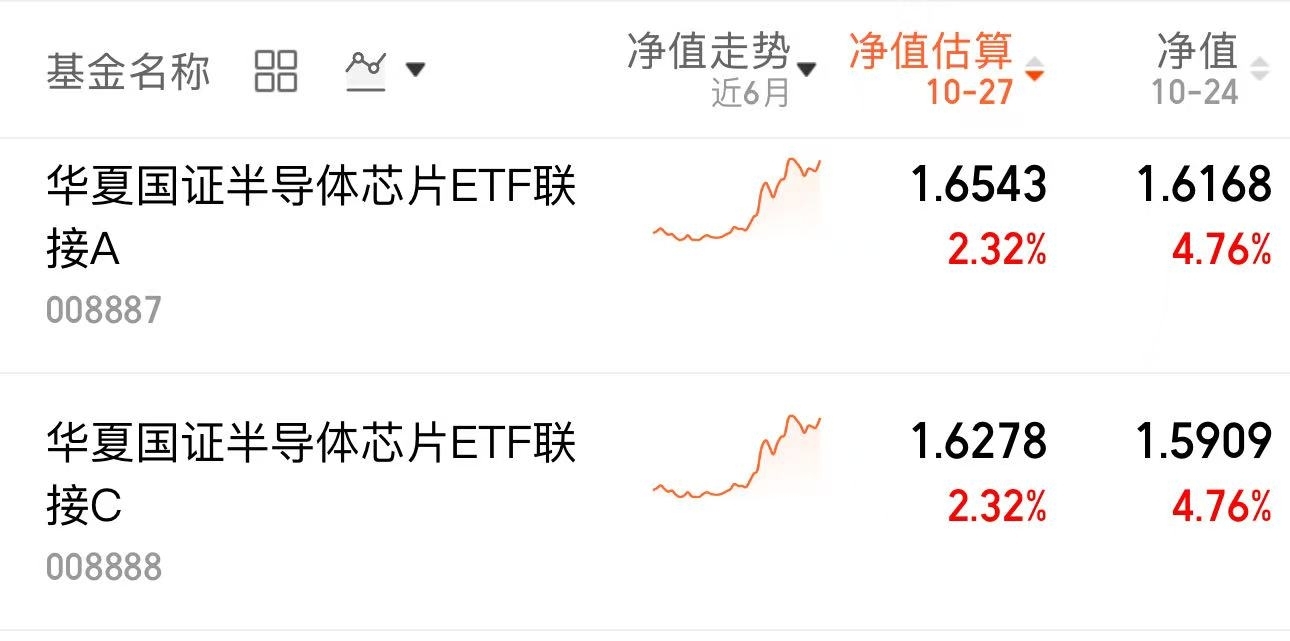 半导体开盘就领涨,上周五4.76%,近3个月收益44.67%,近1年收益53.95%,$华夏国证半导体芯片ETF联接C$持仓覆盖产业链核心企业,期待今天收益继续冲高