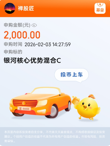 #晒操作#关注已久的$银河核心优势混合C(OTCFUND|016981)$,终于下手啦!今天果断加仓2000元,打算每周二定投!