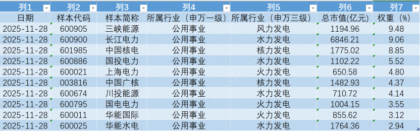 截止11月28日,绿电指数前十大成分股如下: