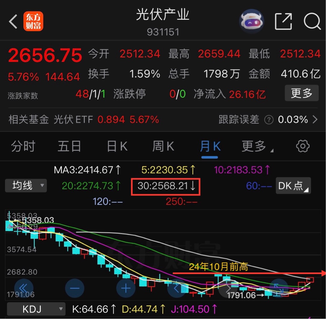 可以参考光伏产业指数回踩2568,或者3、5日线的机会建仓。