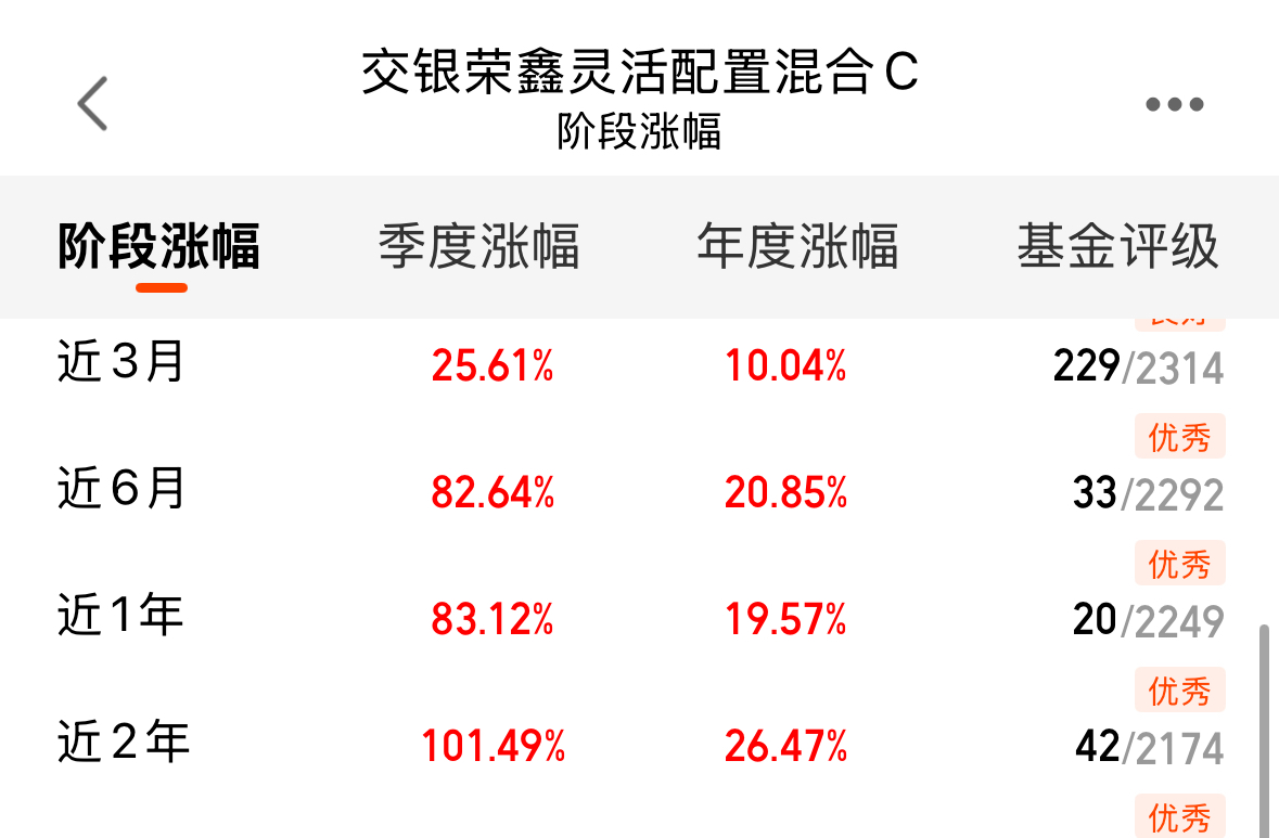 所以A股科技板块加速宣泄情绪之后,性价比也越发的高,我也会继续把握黄金坑的捡筹机会。今天我再加一份交银荣鑫灵活配置混合C,重点专注AI算力和CPO等直接受益AI的细分领域,业绩弹性大,近6月涨幅82.64%,今年以来上涨了91.33%,像这种锐度高的产品在回调的时候进场体验度会更好。
