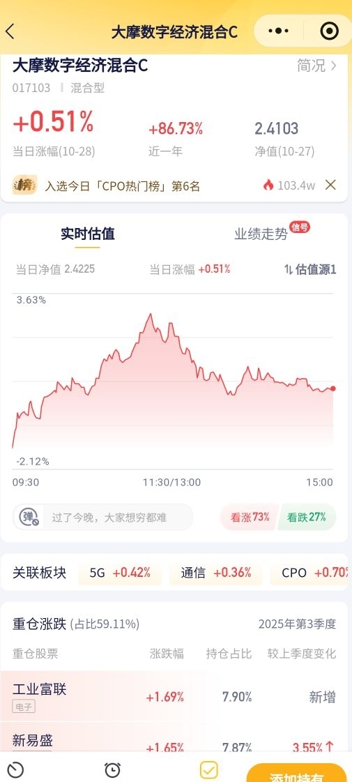 今天A股冲高后有点乏力,沪指跌0.22%,三大指数都微绿。CPO板块靠算力概念走强,福建板块受利好涨得好,有色拖后腿。市场情绪不算差,明天看能不能补量,基金先不动~