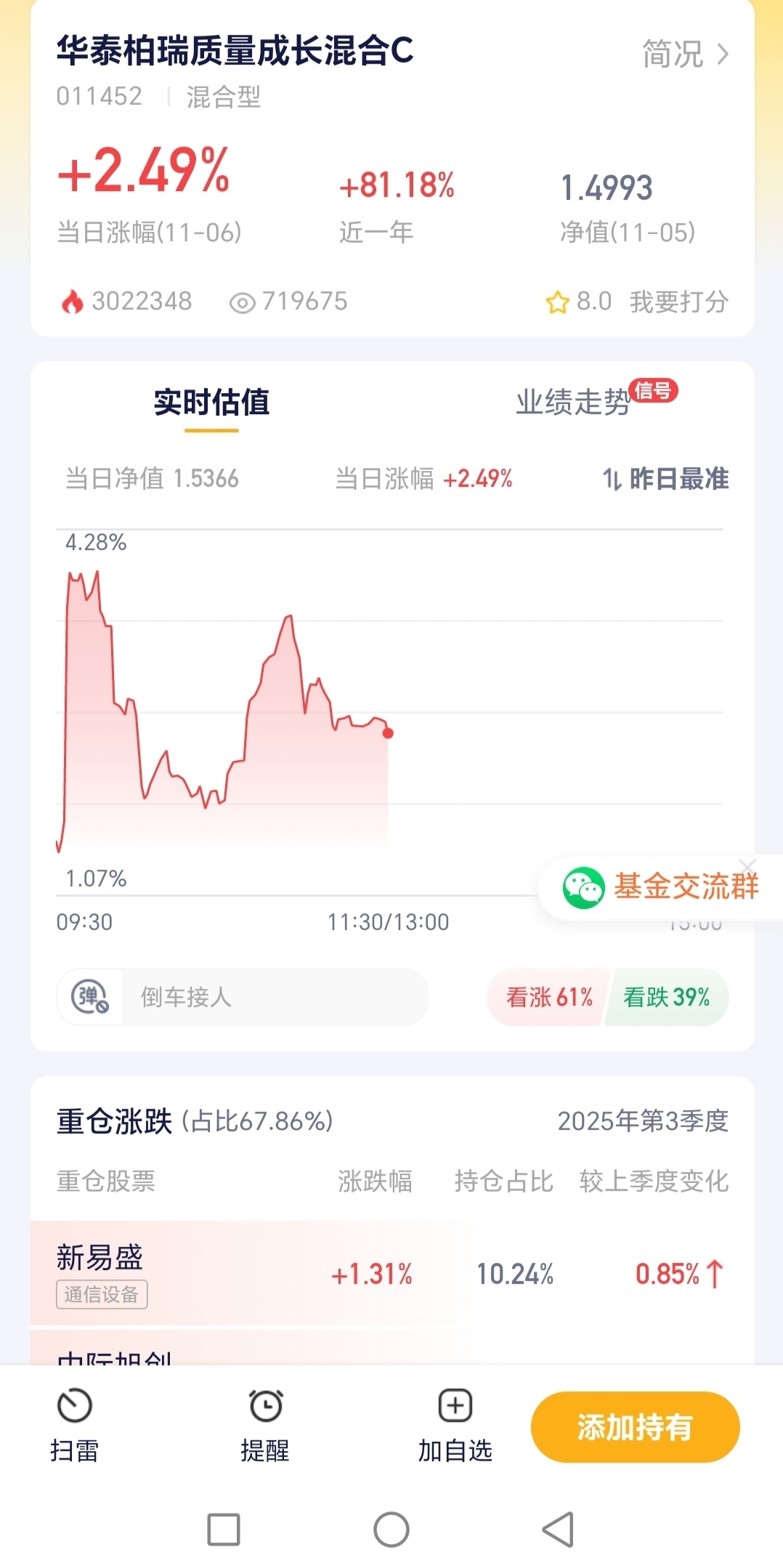 今天CPO行情直接炸了!开盘板块就一路高走,连带着整个科技链都跟着暖起来了。这时候选基金就得看“踩点准不准”——华泰柏瑞这只我盯了挺久,它重仓的刚好是CPO相关的硬逻辑标的,今天行情一来,单日直接涨了2个多点,实时估值都往上跳了!而且近一年80%+的收益也能看出来,这基不光能蹭热点,长期拿也抗打,对咱们不想盯盘的人来说,这不就是“躺赚CPO行情”的好选择嘛~$华泰柏瑞质量成长C$ #A股突破4000点!下个目标位在哪?#