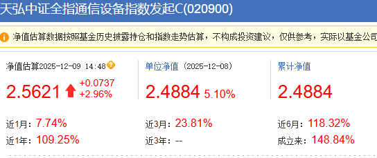 $天弘中证全指通信设备指数发起C$ 中证通信设备指数突破前高压力,整个趋势还不错,长期来看还有很大空间,手上的这个就是CPO,所以弹性也更大,业绩上看昨天上涨5.11%,今天盘中一度涨逾3%,进来就加鸡腿。光模块核心部件全球缺货、英伟达H200被允许出口⋯多重利好消息叠加,算力持续爆发,也夯实了CPO的主线地位,上部空间已经打开,不好操作,我就分批跟上吧。
