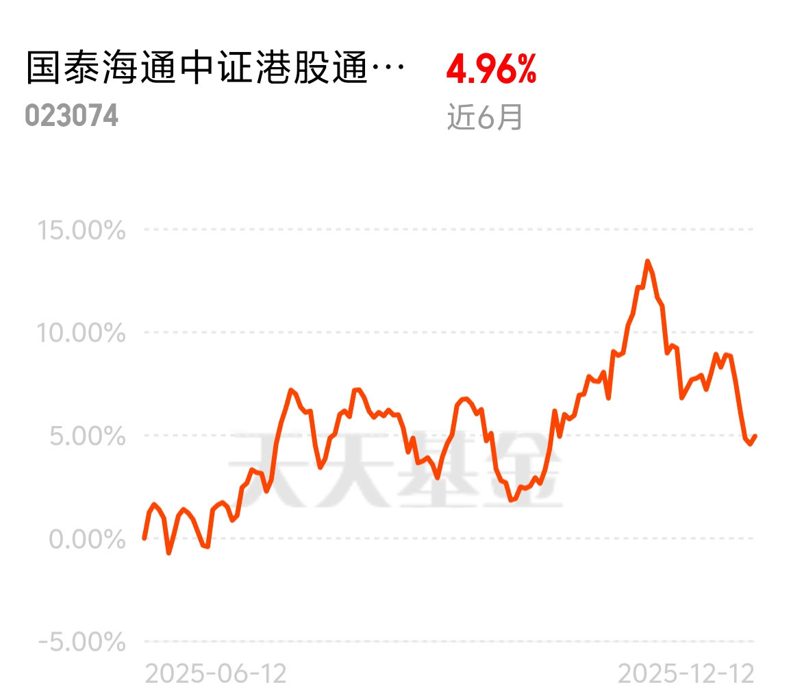 港股科技股经历前 10 月大涨后,四季度回调近 20%,涨涨跌跌磨人。还好我持仓国泰海通中证港股通高股息投资指数发起 (QDII) C,近 6 月 4.96% 收益,0.66% 估值没毛病。$国泰海通中证港股通高股息投资指数发起(QDII)C$