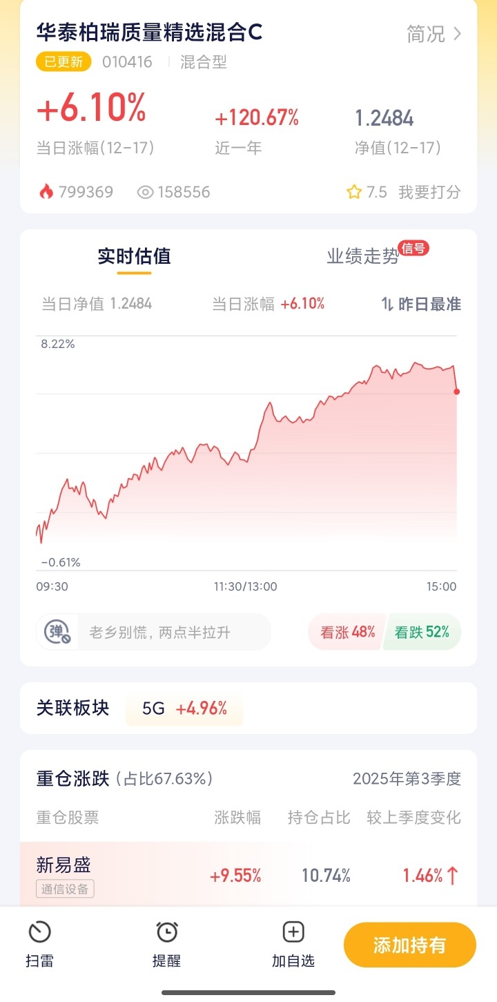 最近5G产业链的好消息一个接一个,不管是上游的芯片、设备,还是下游的应用、服务,都有不少亮眼表现。随着数字经济的推进,5G作为核心基础设施,未来的发展空间真的不小。不过市场波动也不小,单押某一只股票风险太高,不如把钱交给专业的人打理。华泰柏瑞的投资风格偏稳健,注重挖掘企业的内在价值,不会跟着市场瞎起哄,在5G行情起伏的时候,能帮我们稳住收益,对于追求长期稳健回报的投资者来说,是个很不错的选择。$华泰柏瑞质量精选混合C$