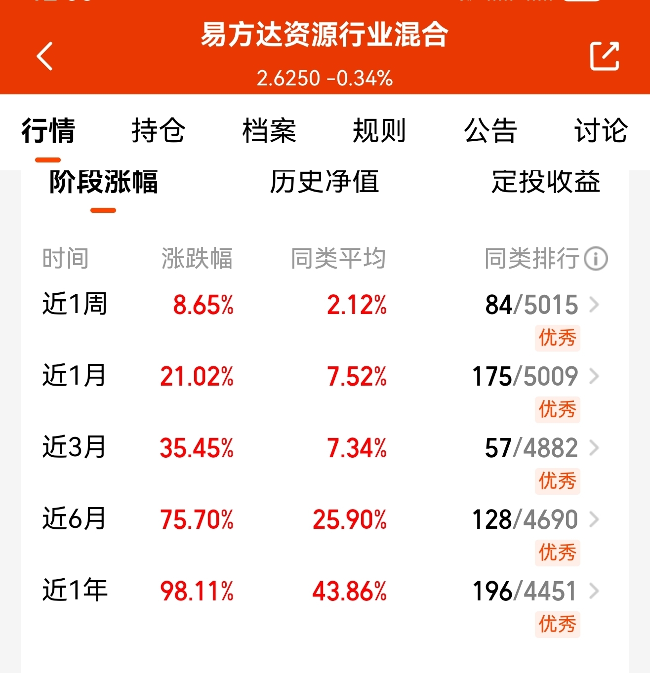 当下资源行业需求迎调整,新能源高增拉动有色需求,板块持续走高。$易方达资源行业混合$ 持仓极度聚焦有色金属,前十大重仓股无其他板块,近三月涨幅达35.45%,业绩表现出众,跑赢同类基金。$东财证券30C$ $东财光伏C$ $国泰有色矿业ETF联接C$ 都涨了