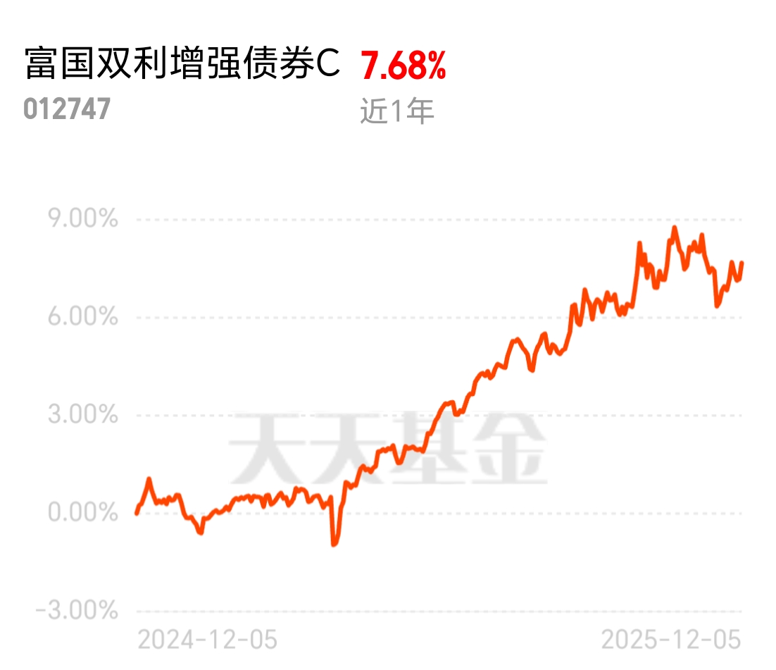 近期易方达岁丰添利C一直没动静,转而多看了眼富国双利增强C——近1周涨0.5%,近6个月5%、1年8%,各阶段都跑赢同类;基金经理擅长大类资产配置,三季报押中有色和非银。过去一年超67%的周帐户是红的,押注确实稳扎稳打些。$富国双利增强债券C$