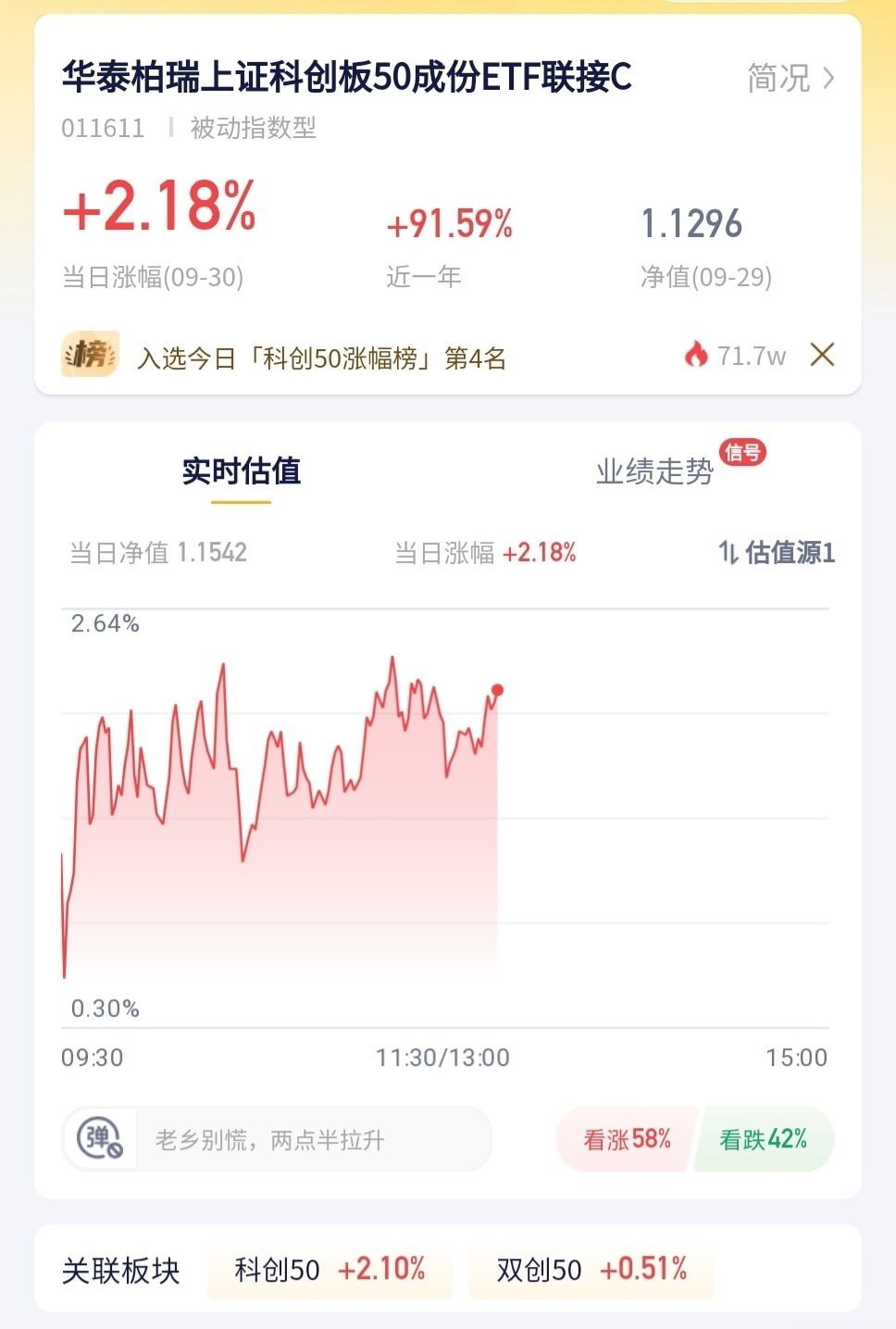 刚才刷行情看到科创50今天表现真亮眼,半天就涨了2%,有色金属和半导体产业链全起来了,整个板块透着一股劲儿。之前就听人说科创板块估值在历史低位,政策又一直在支持,现在看来确实在慢慢发力,从9月23号到29号,有好几天都是上涨的,尤其24号那波大涨特别提气。我准备入手华泰柏瑞的相关产品,它近期跟着指数的节奏特别准,指数涨的时候它的收益很实在,关键是C类费率友好,短期操作成本低,很符合我想抓一波科技行情的想法。