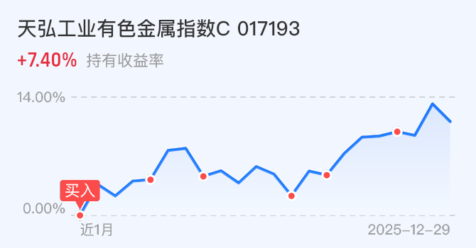 我加仓$天弘工业有色金属指数C(OTCFUND|017193)$10000元!跟踪的工业有色指数这会看逆市涨超2%,一根大阳线直接反包昨天跌幅、重回5日线之上!还以为要调整几天,没想到走的这么强,趁还没新高我抓紧再上车一笔。