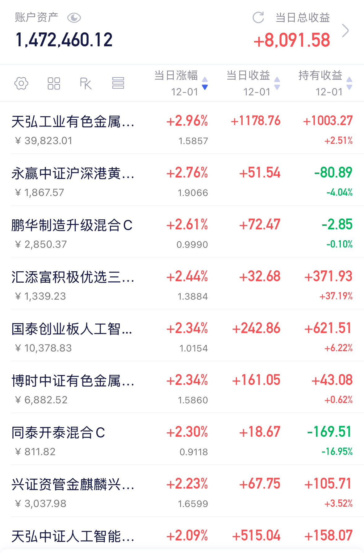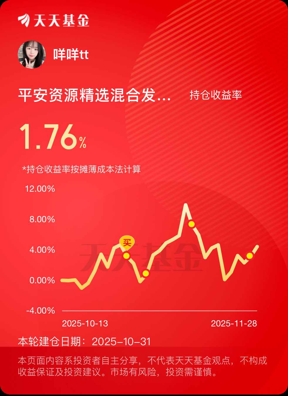 暴暴暴涨了!兄弟姐妹们,资源品今天全线暴涨,上周四咩咩果断大额冲的平安资源精选混合发起式C今天一口大肉没得跑。势头正猛,我乘胜追击再大额加5000。
