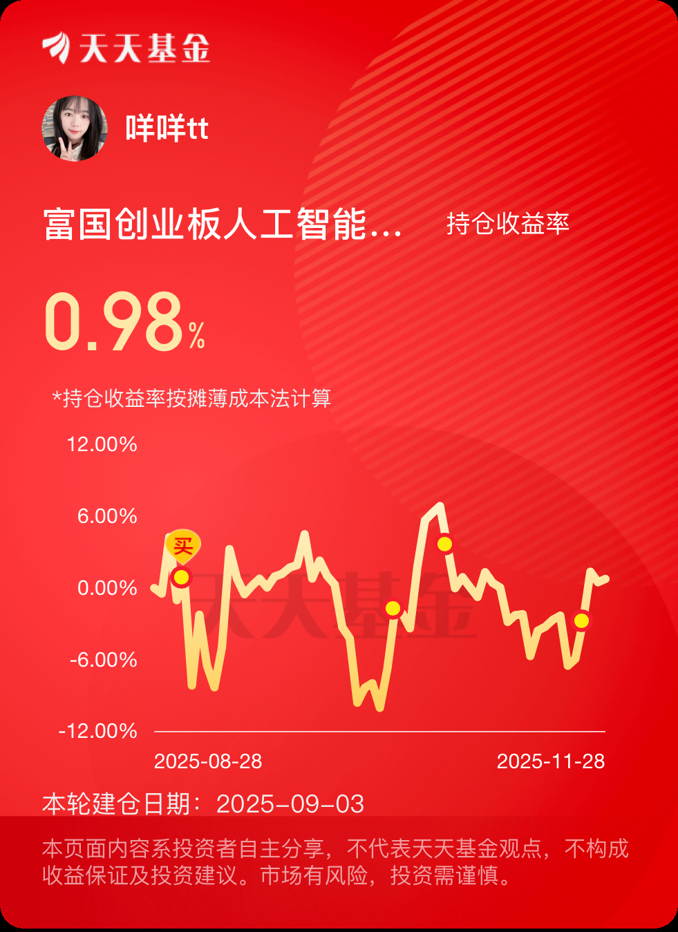 除了黄金等有色金属外,今天人工智能涨的也还不错,创业板人工智能指数早盘冲高涨逾2个点,5日线上穿60日线继续演绎强者恒强。咩咩早前埋伏布局的富国创业板人工智能ETF联接C最近大肉不断,近1周涨了7.76%,今天继续吃肉的同时我也右侧追加了一份。