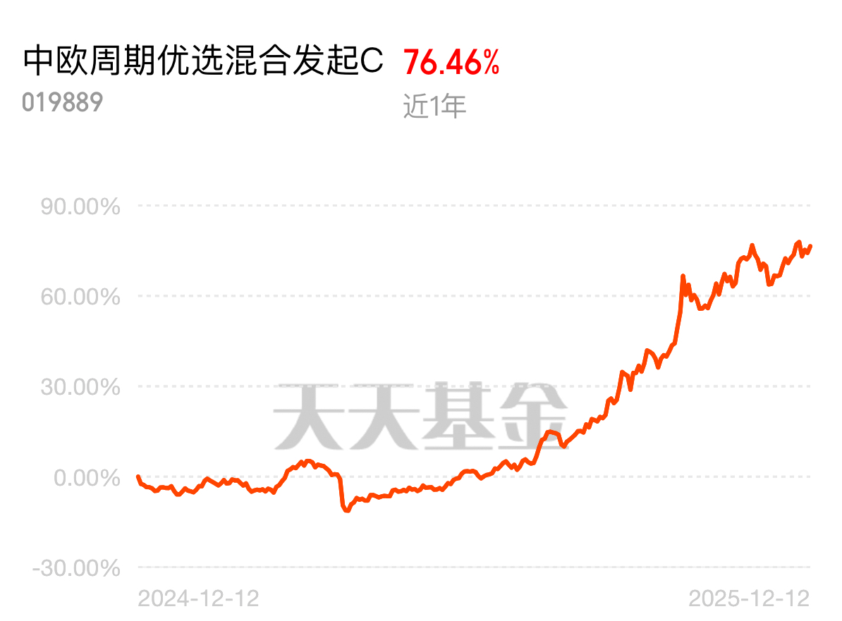 12 月国际工业金属价格反弹不停,周期资源品成市场香饽饽,供需缺口还在扩大。中欧周期优选混合发起 C 近 1 年 76.46%,业绩顶尖,长期短期都靠谱。