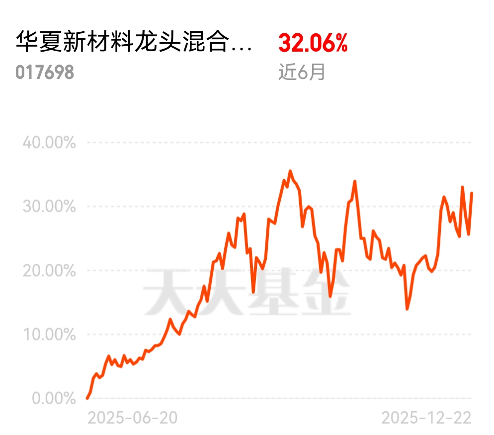 新材料板块今天表现很活跃,果然只要整体市场一回暖,这里就会反弹很强势,看了下今天涨幅有5.1%,不愧是我的心头基,近6个月收益也有32.06%了,看了下$华夏新材料龙头混合发起式C$的持仓都是当前的热门赛道,小盘成长风格突出所以弹性也不错,可以追,明天过来继续加