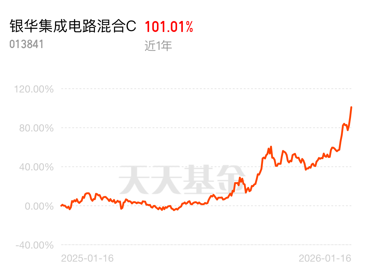 半导体板块轮动到主线,资金扎堆涌入核心标的。银华集成电路混合 C 今天大涨,近一年101.01%收益够顶。当下位置合适,果断续投一波!