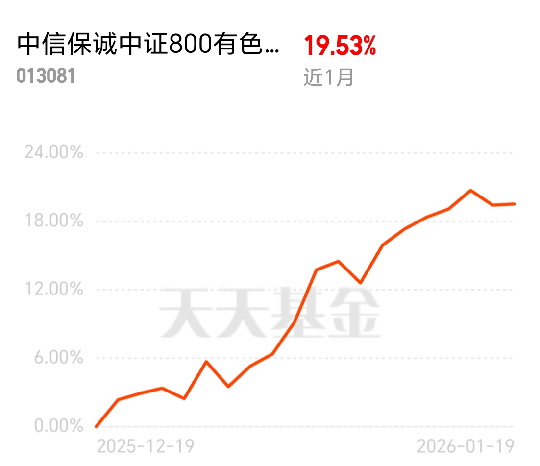 贵金属上涨带动有色板块整体走强,近期回调是短期调整。中信保诚中证 800 有色指数 (LOF) C 近 1 月涨 19.53%,回调加仓,跟上板块轮动节奏。