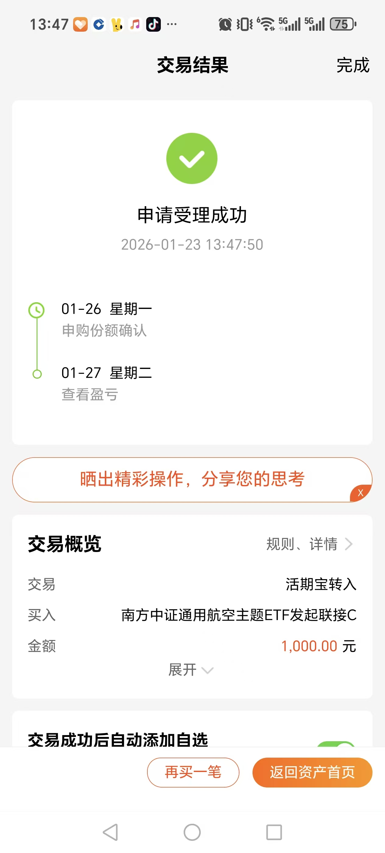 买入 $南方中证通用航空主题ETF发起联接C$ 1000元