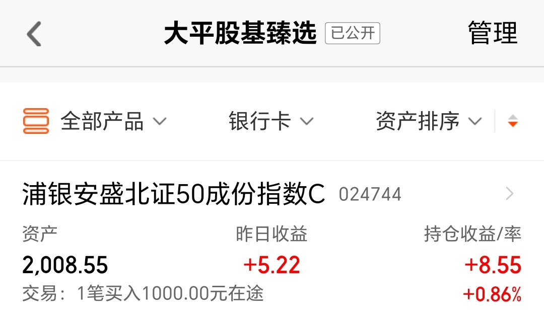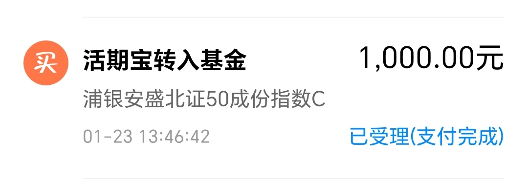 今天我买入$浦银安盛北证50成份指数C(OTCFUND|024744)$1000块钱。