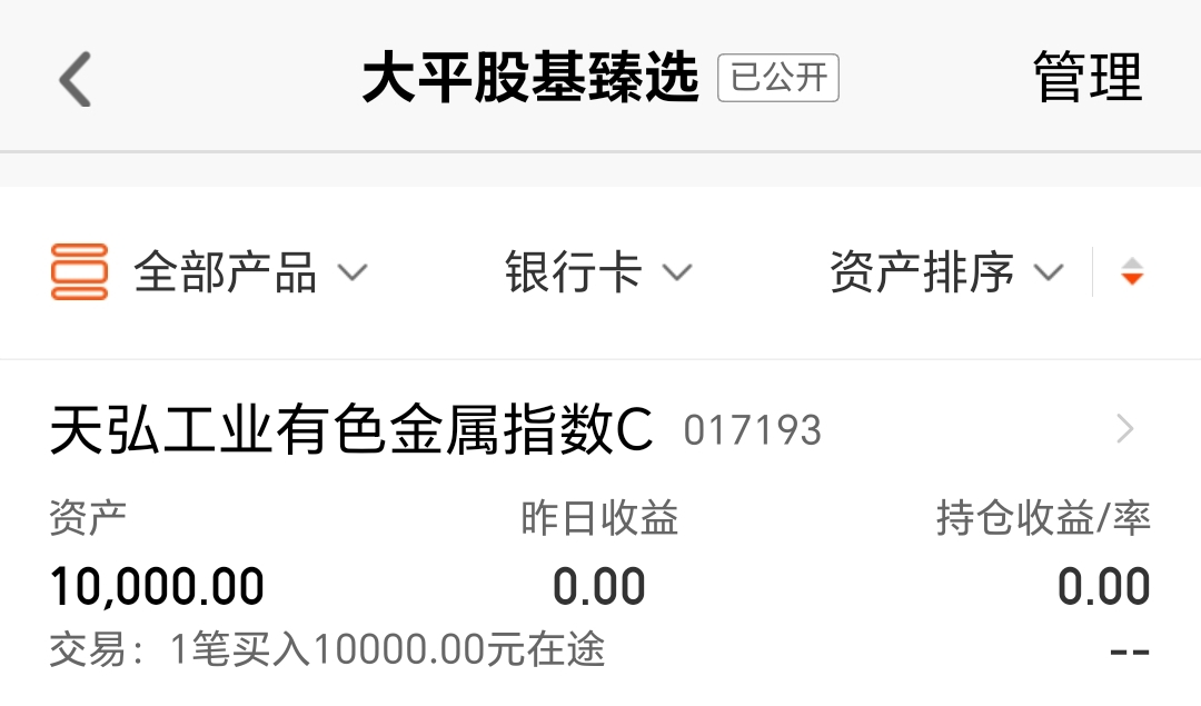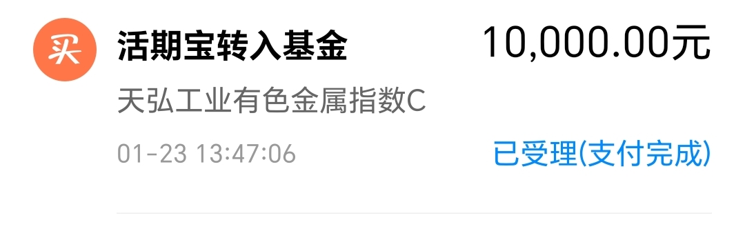 今天我买入$天弘工业有色金属指数C(OTCFUND|017193)$1万块钱。