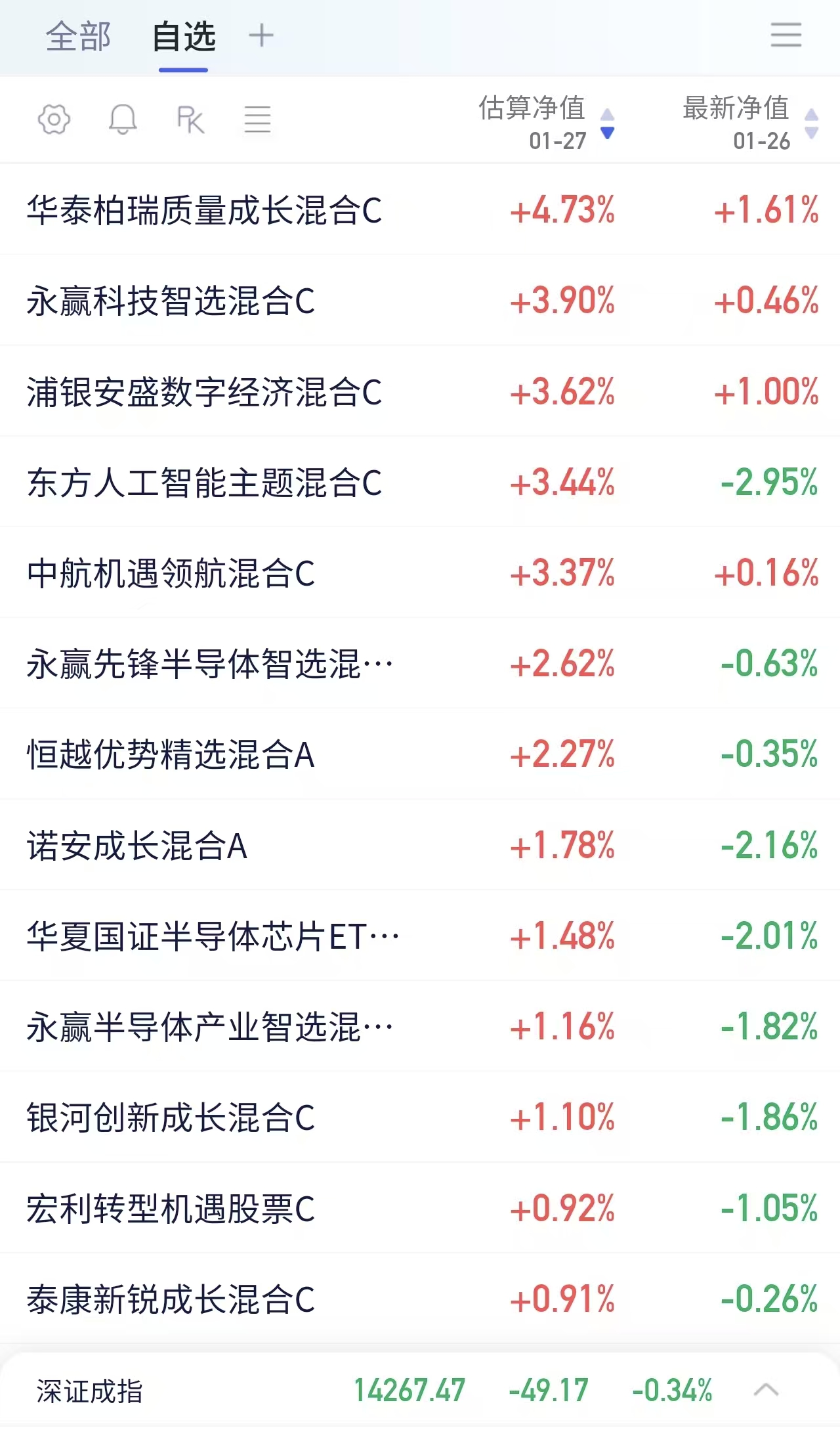 以下是部分自选基金当日收益估算(1:02分左右数据):