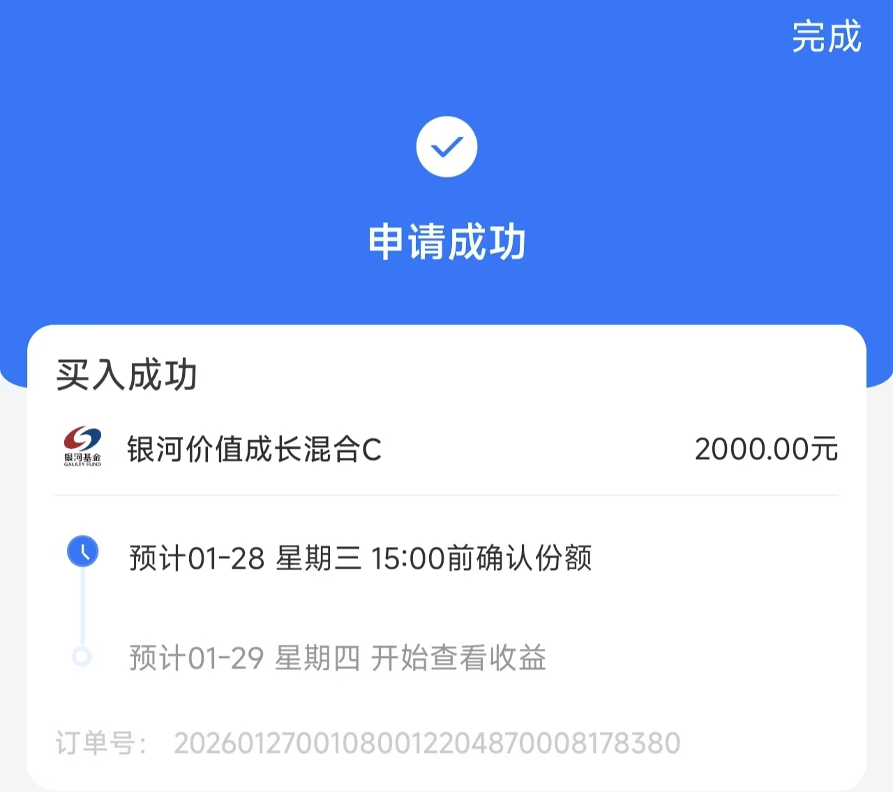 加仓2000元$银河价值成长混合C(OTCFUND|016341)$,最近大盘出现较大波动,上证指数今天盘中逼近4100点,但是该基金表现十分稳健,之前已经连续6天上涨了,净值连续创新高,是我近期表现最稳最强基金之一,我在近期持续布局,也算是真正吃到肉了,拉长时间看,该基金近一年累计收益率为128%,多阶段表现优秀,为什么该基金能有如此表现,也与其持仓有关,该基金多季度持续布局有色金属和基础化工两大强周期赛道。而由于美联储开启降息周期,全球去美元化,AI算力、机器人、商业航天、半导体等新兴产业快速发展,为有色和化工材料开辟了全新应用场景,在多种因素影响下,有色金属和基础化工联手步入超级牛市。