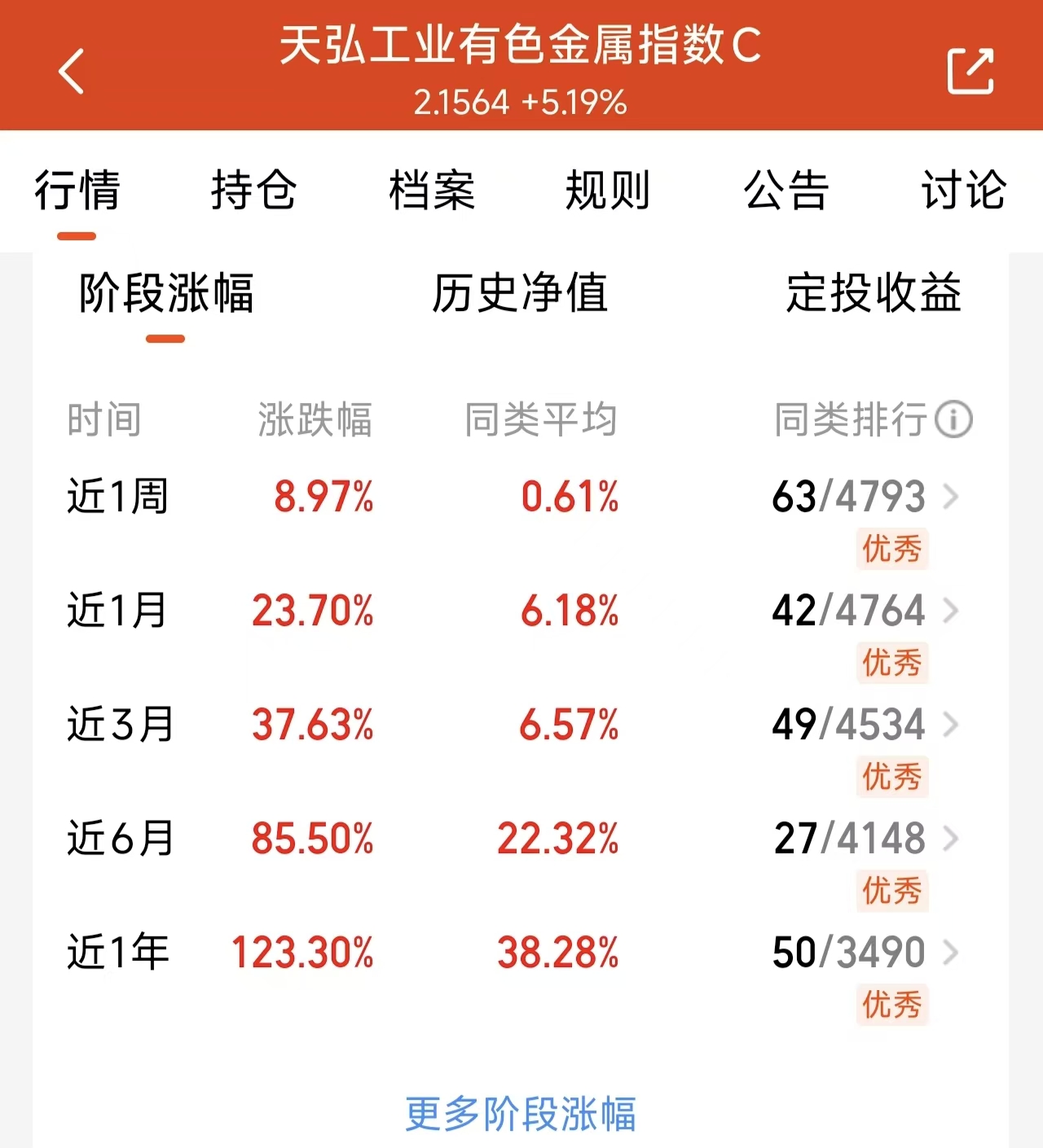 因此我感觉工业有色金属相对于贵金属潜力更大,未来更加确定,是一个很不错的方向,天弘基金的指数基金产品在业内以规模领先、费率低廉、品种齐全和服务普惠著称,我也一直配置的有他家的产品,上周加仓又加对了,今天决定乘胜追加3000元该基金。