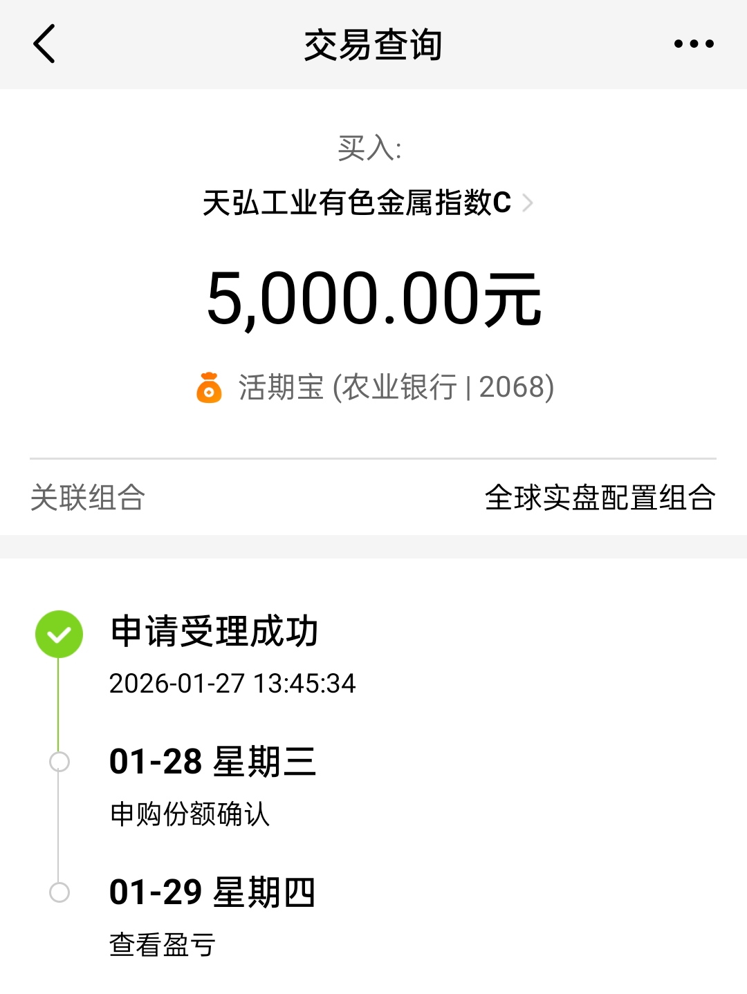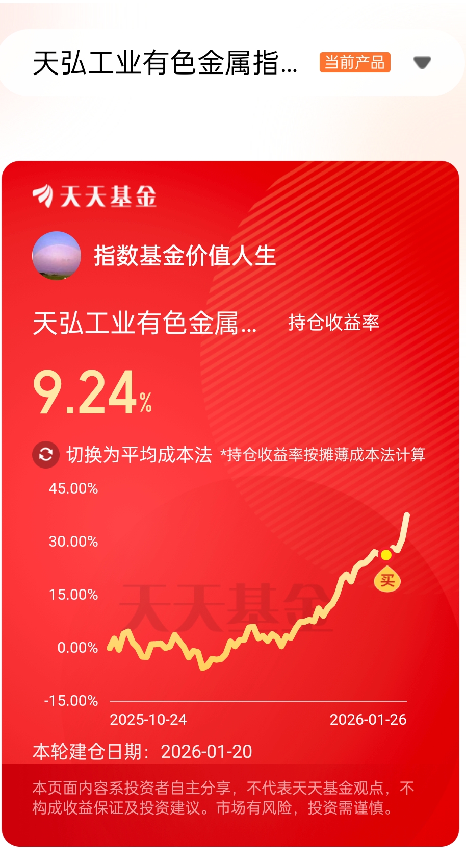 今天上车5000元的$天弘工业有色金属指数C(OTCFUND|017193)$,利用指数基金捕捉这次工业有色金属行情。