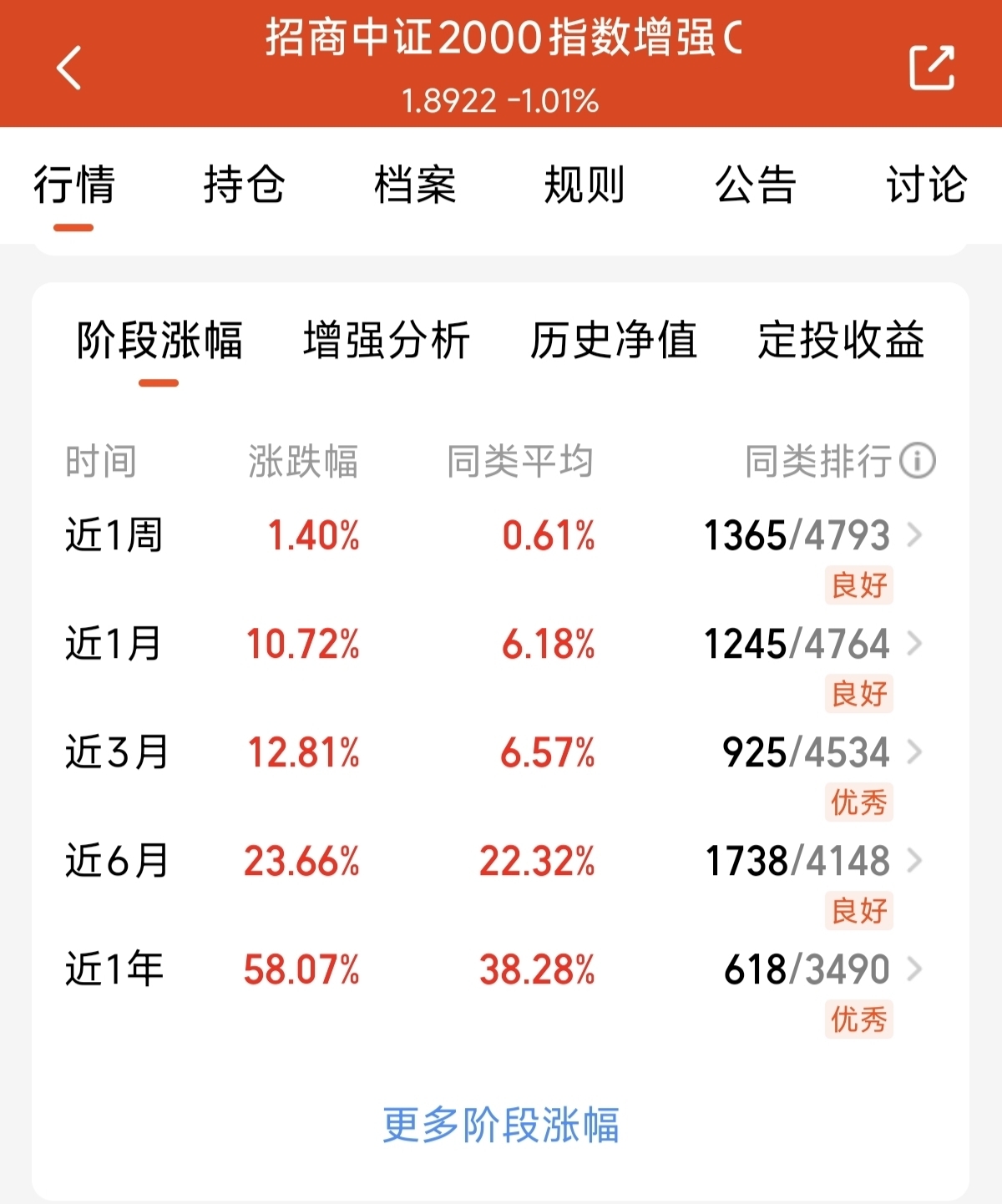 $招商中证2000指数增强C$ 这是聚焦小盘的指数增强基金。紧跟指数的同时还有增强部分的灵活配置。近半年上涨了23.66%,近一年上涨了58.07%。在同类基金中业绩长期做到了优秀。增强部分的超额收益强,而且遇到波动回撤也是比较小,我看好未来的成长表现。
