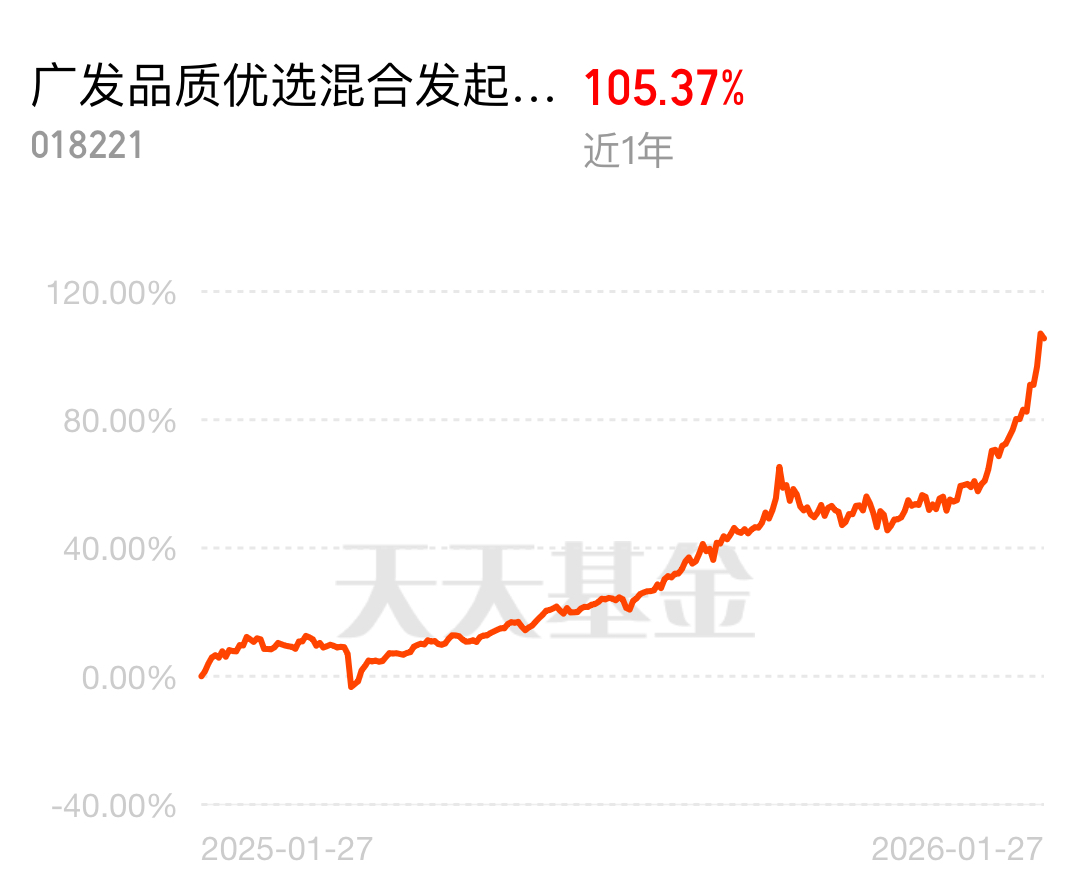 从上周贵金属那波暴力拉升就能看出来,行情还没。我早就说了,像广发品质优选混合C这种集中火力干有色的基,拿稳就行了,近一个月涨了快30个点,偶尔有波动也很正常,今天反弹上涨,弹性不错$广发品质优选混合发起式C$