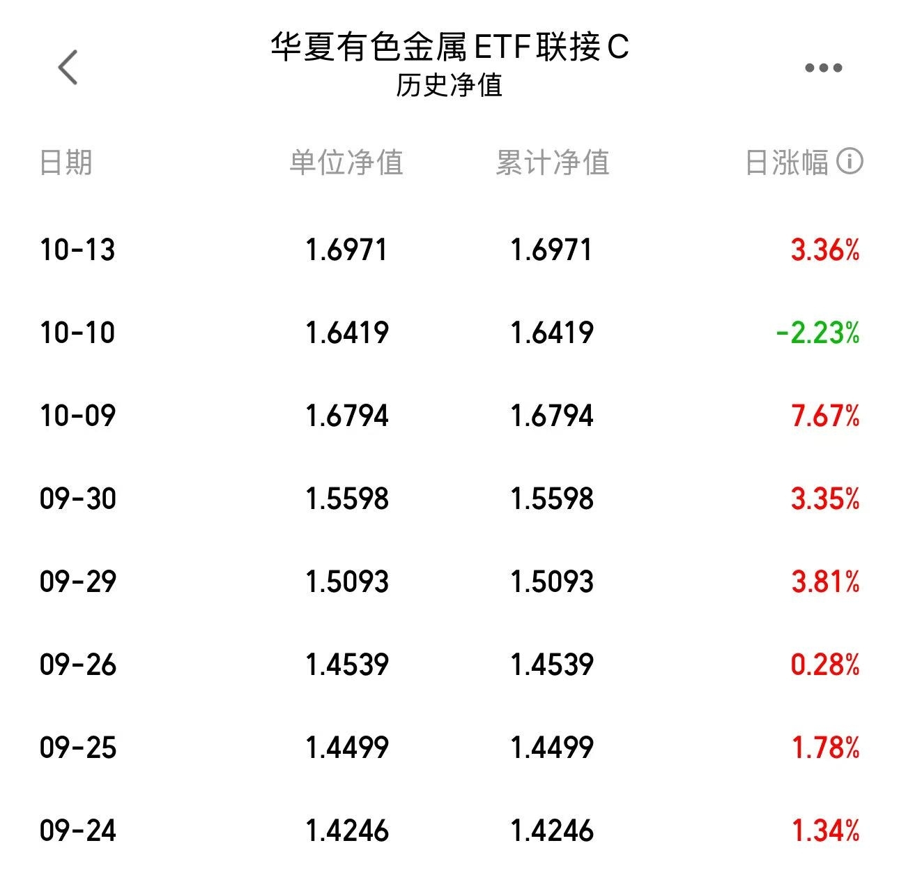 开盘即上涨2%+,昨天更是逆势上涨超3%,D份额还有7免,费率更低,$华夏有色金属ETF联接C$行业景气度高,持仓覆盖板块多赛道,最近几天走势都不错,值得布局