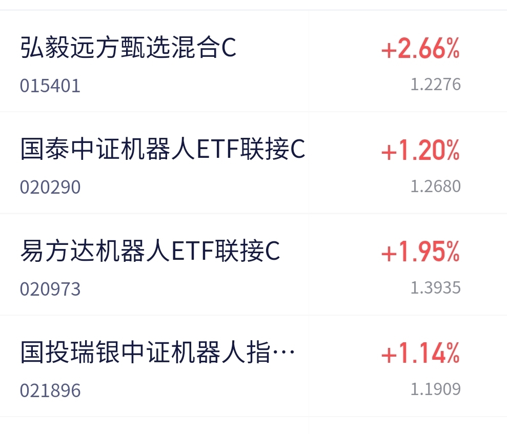 今天继续延续之前的下跌风格,但是机器人表现却很突出。$弘毅远方甄选混合C$ 我一直很看好机器人未来的前景,尤其是人情机器人,这绝对是未来的黄金赛道。