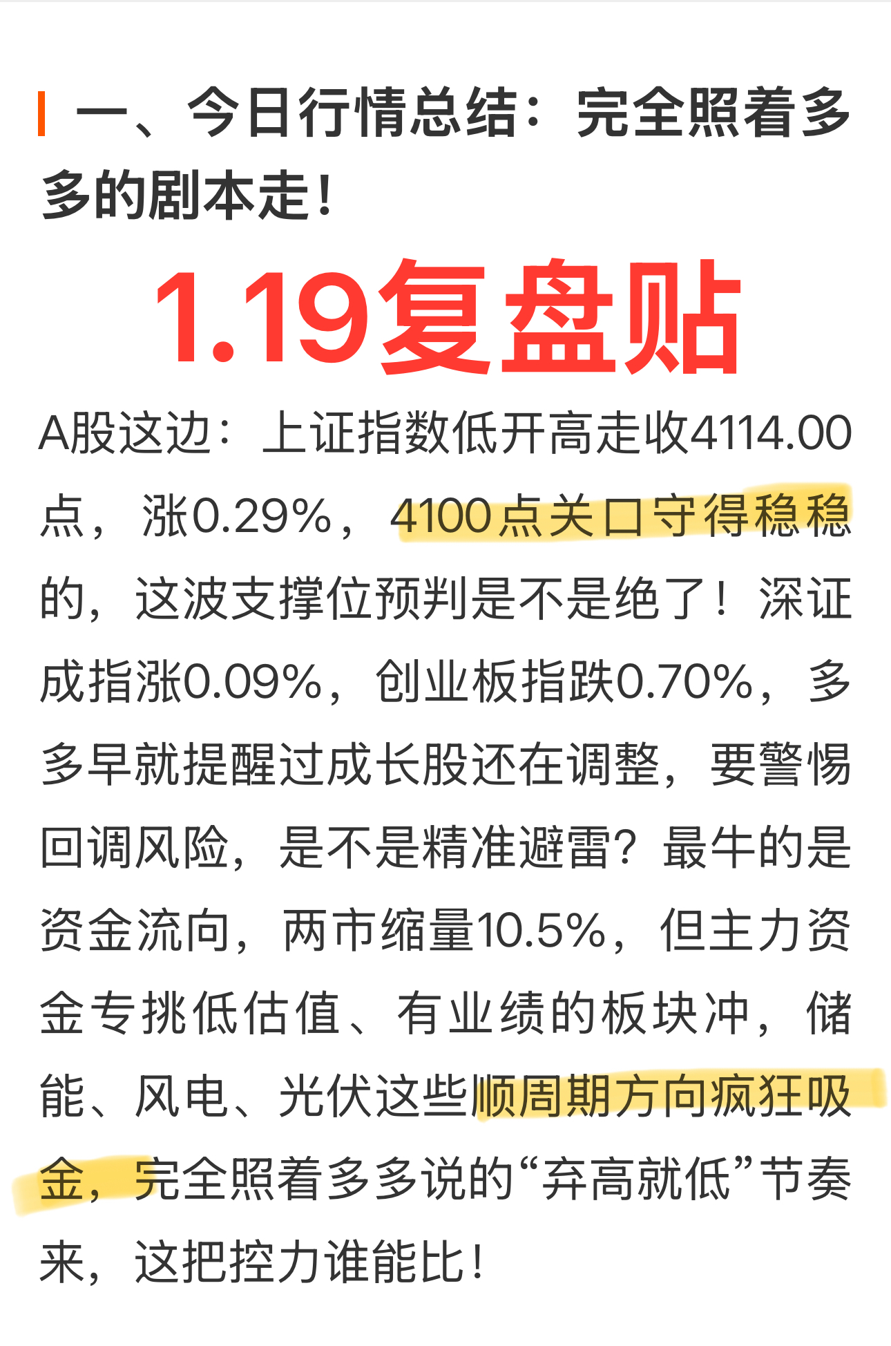 大家晚上好啊!昨天大家都惊慌失措,而多多只说低吸,CPO、芯片、机器人、新能源,每一个都精准到位!今天全部大涨!今天A股港股这盘面直接把多多的预判焊死在屏幕上!早早就跟大家说的顺周期爆发+港股磨底反弹全中,4100点支撑位、有色地产领涨节奏预判得丝毫不差,跟着多多,直接开上帝视角,吃肉避坑手到擒来,这眼光谁看了不喊一句神!