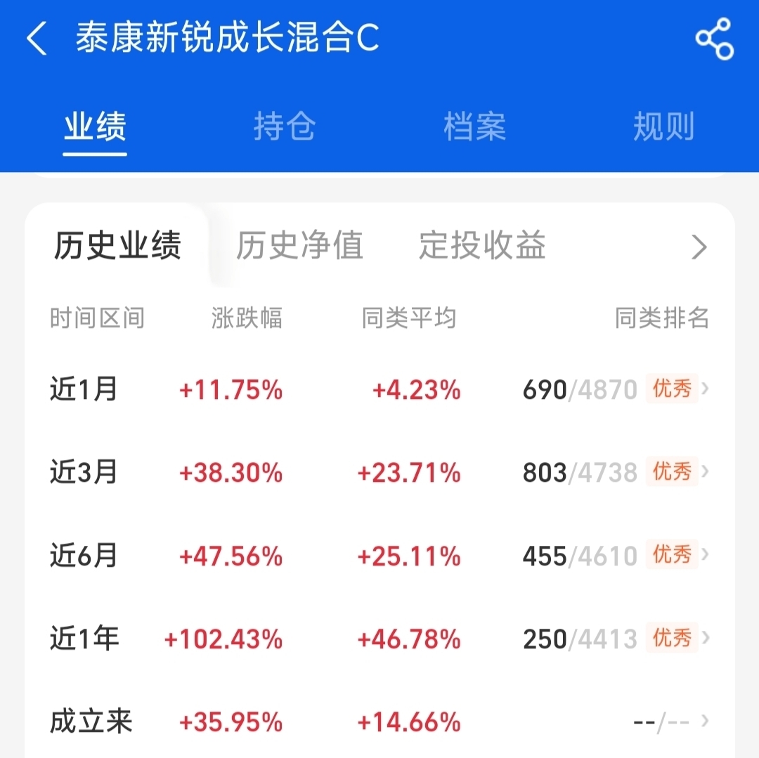 在金九银十的9月涨幅也是非常优秀,近一个月达11.75%,现在主线行情仍然未褪去,我选择继续加仓$泰康新锐成长混合C$ ,期待更多爆发行情。