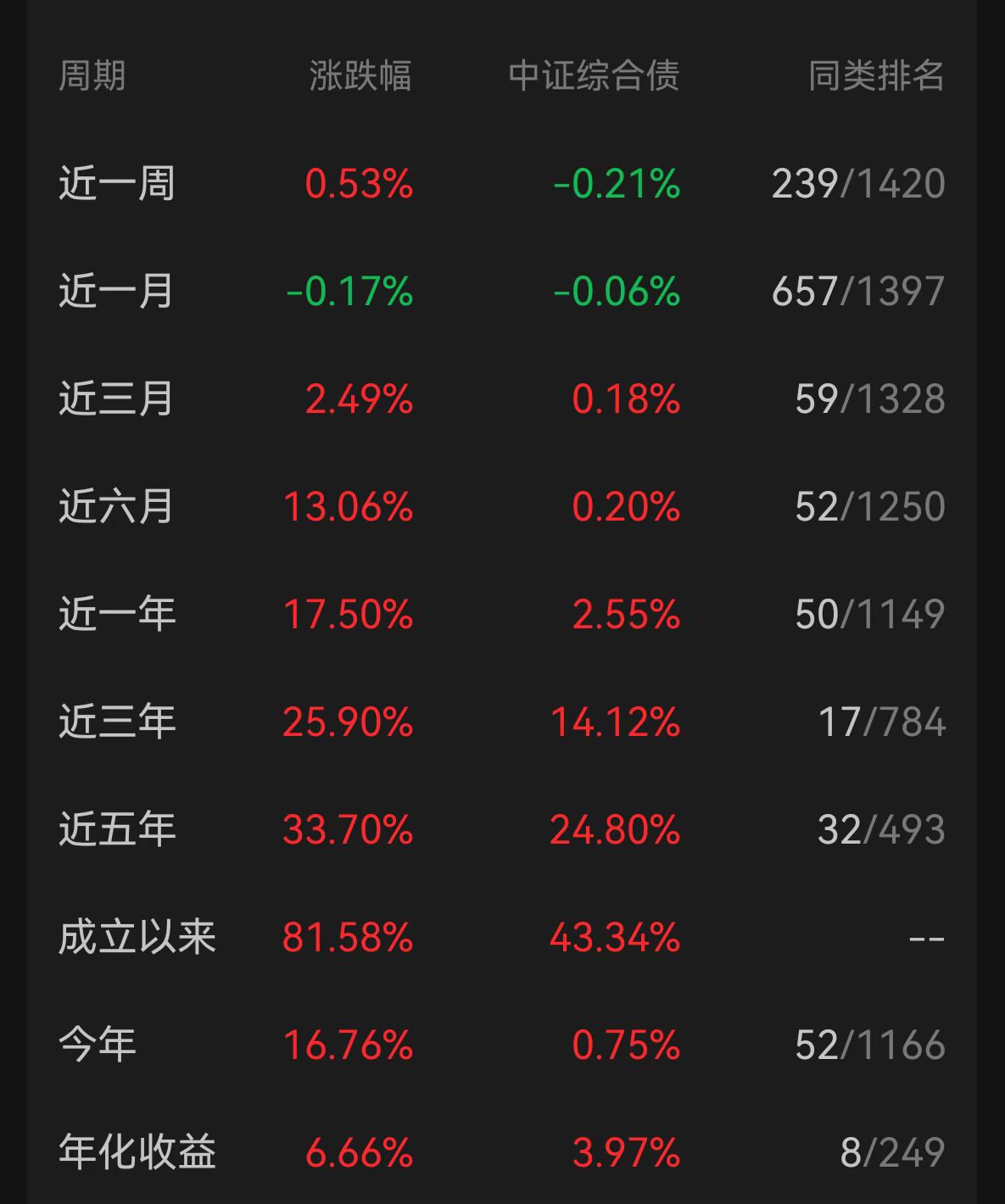 说到优质标的,$易方达裕鑫债券C(OTCFUND|003134)$必须吹爆!近期修复速度堪比火箭,近一周产蛋53个,近三月249个,近六月收益13。06%,近一年大涨17.5%!不仅碾压中证综合债,近一年收益更是远超沪深300!最绝的是风控,近一年最大回撤还不到沪深300的一半,节奏把控超敏锐,稳稳站在固收+业绩第一梯队,小风险撬动大收益!