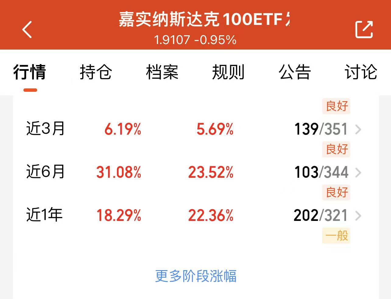 $嘉实纳斯达克100ETF发起联接(QDII)C人民币$ 想必很多人都不陌生,基本没限额过,经理持仓复刻指数走势,准确性高,现在美股疲软,有下迭的趋势,刚好可以关注起来了。