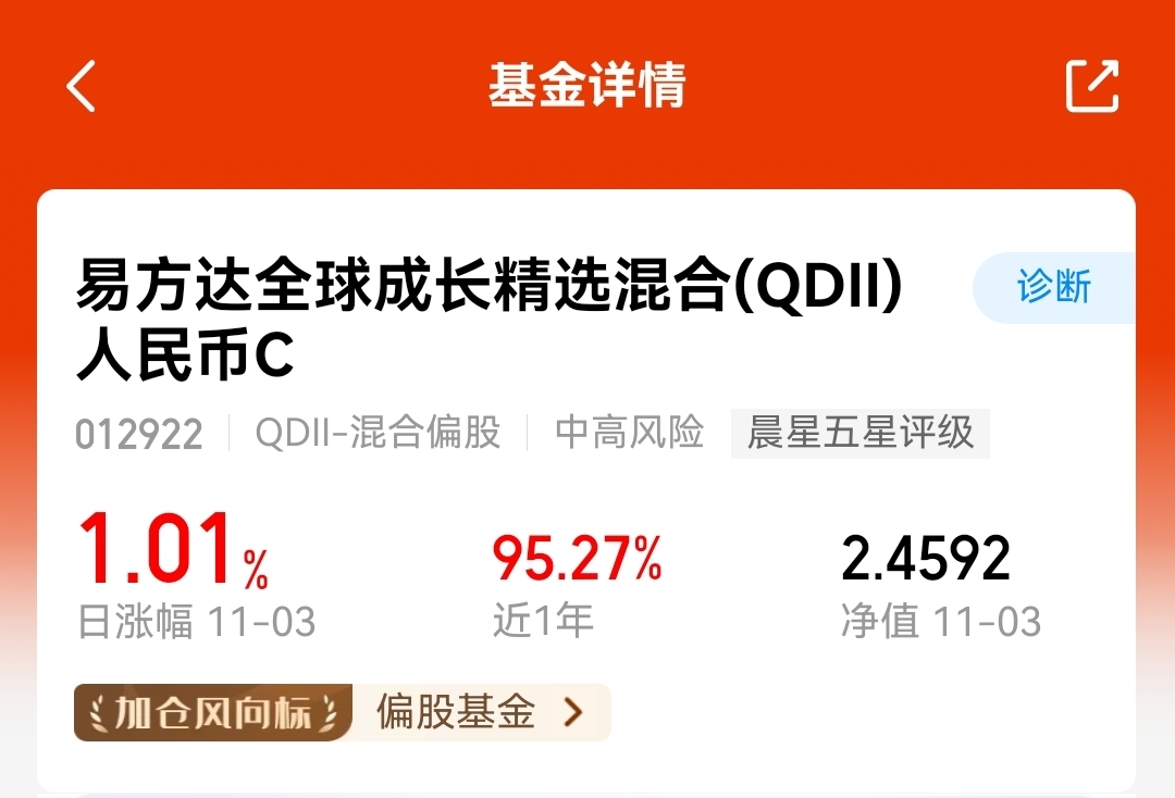 只是考虑阶段风险,我还是比较看好这支$易方达全球成长精选混合(QDII)人民币C$ ,主要策略是布局全球,A、H、美股都能投,经理调仓能力强,也是能灵活规避政治风险了,同时可以把握多个市场的科技板块的反弹,我觉得这样赚钱效应还是不错滴;