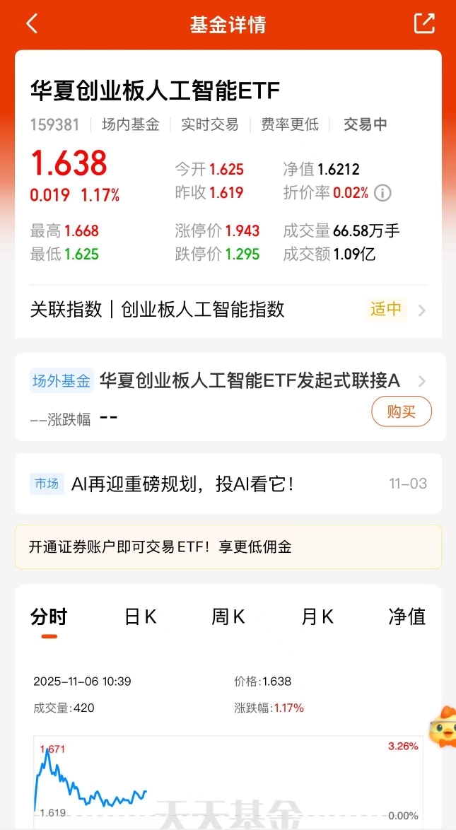 昨天加仓是最机智的选择,今天反弹上涨,场内近6个月收益排名同类28,收益还有上涨空间,继续持仓$华夏创业板人工智能ETF发起式联接C$