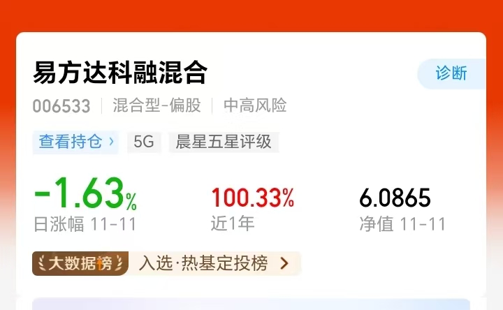 近期A股波动明显,板块切换频繁,单一赛道风险抬升,我觉得目前这个混沌期间,主线不明确的时候,多配置点均衡布局的产品来分散风险是挺不错的。$易方达科融混合(OTCFUND|006533)$同时布局A+H股与 $易方达科讯混合(OTCFUND|110029)$(聚焦A 股)同一策略,覆盖科技、新能源、军工等高成长领域。前者近一年涨 100.33%,两者均回撤小、机构占比高,还是挺适配板块轮动节奏,持有也更放心。