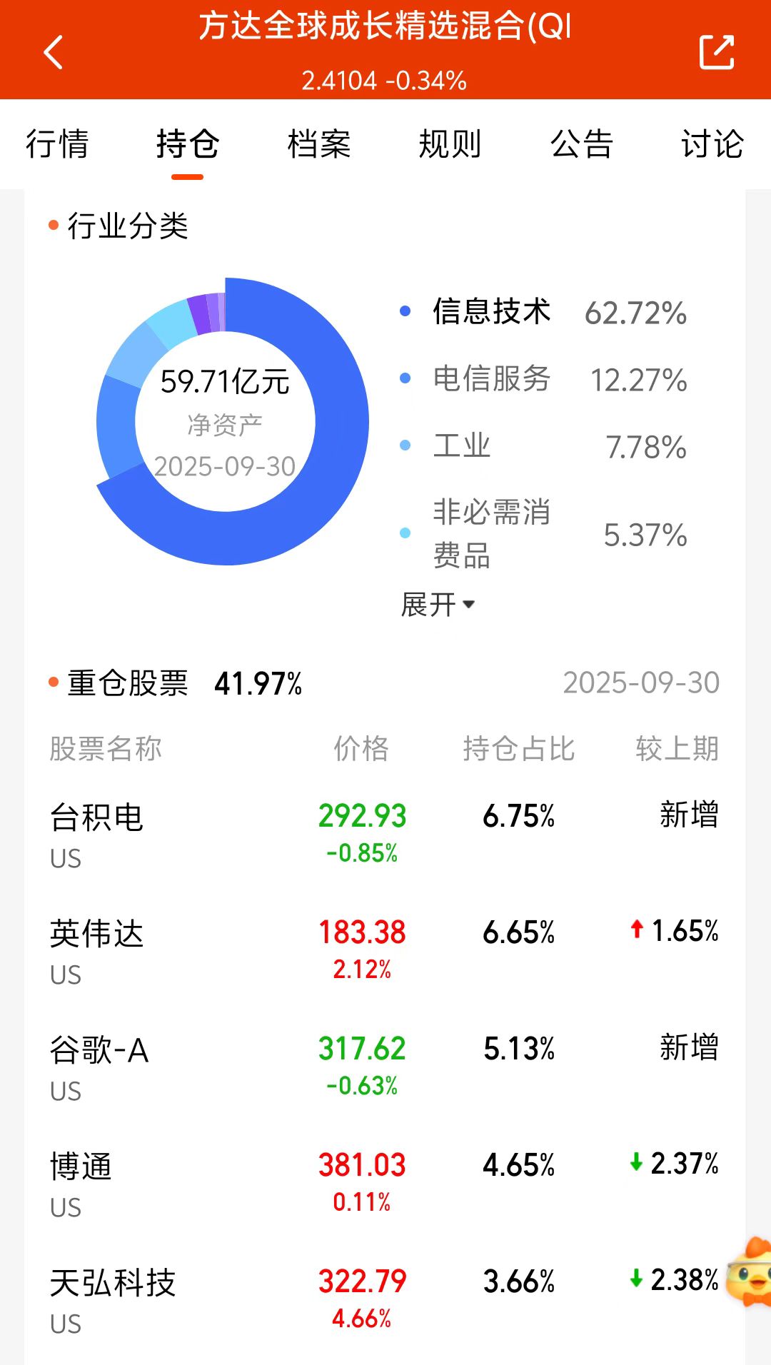 今日市场低开高走,重返3900点,当前行情科技还是我们重点关注的方向,在产品的选择上我更加关注具有稀缺性的品,就像我持有的$易方达全球成长精选混合(QDII)人民币C$ 012922,这个基在郑总的掌舵下,业绩优秀,近一年涨超80%,抗跌能涨,我还是非常看好郑总的选股能力的,其布局A股、港股、美股多地的科技龙头企业,非常不错!