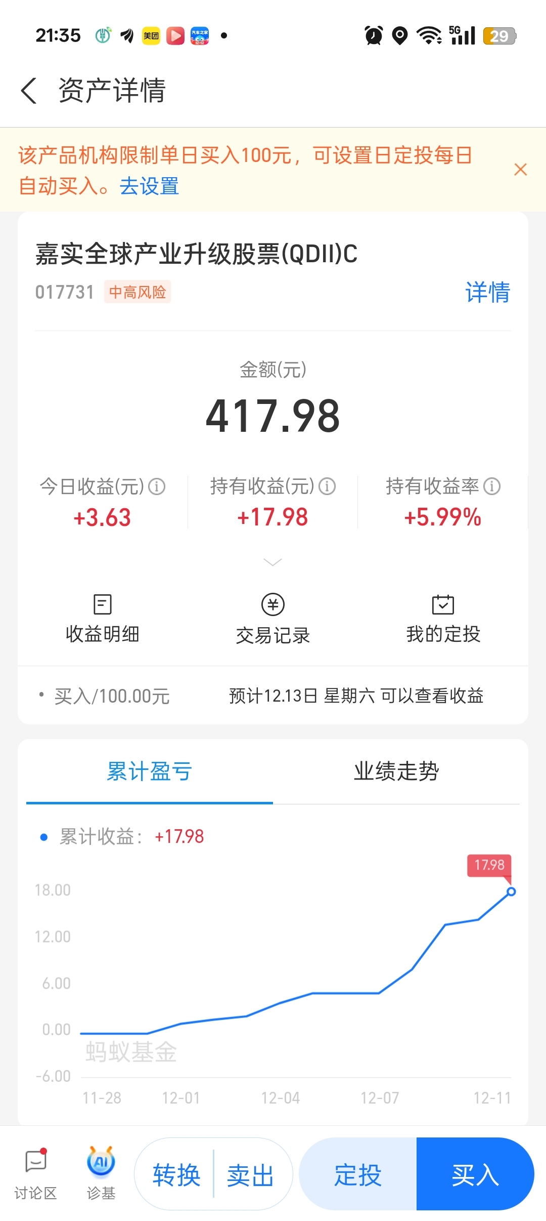 这个基金太给力了,可惜限购了哎,一天只能买一百