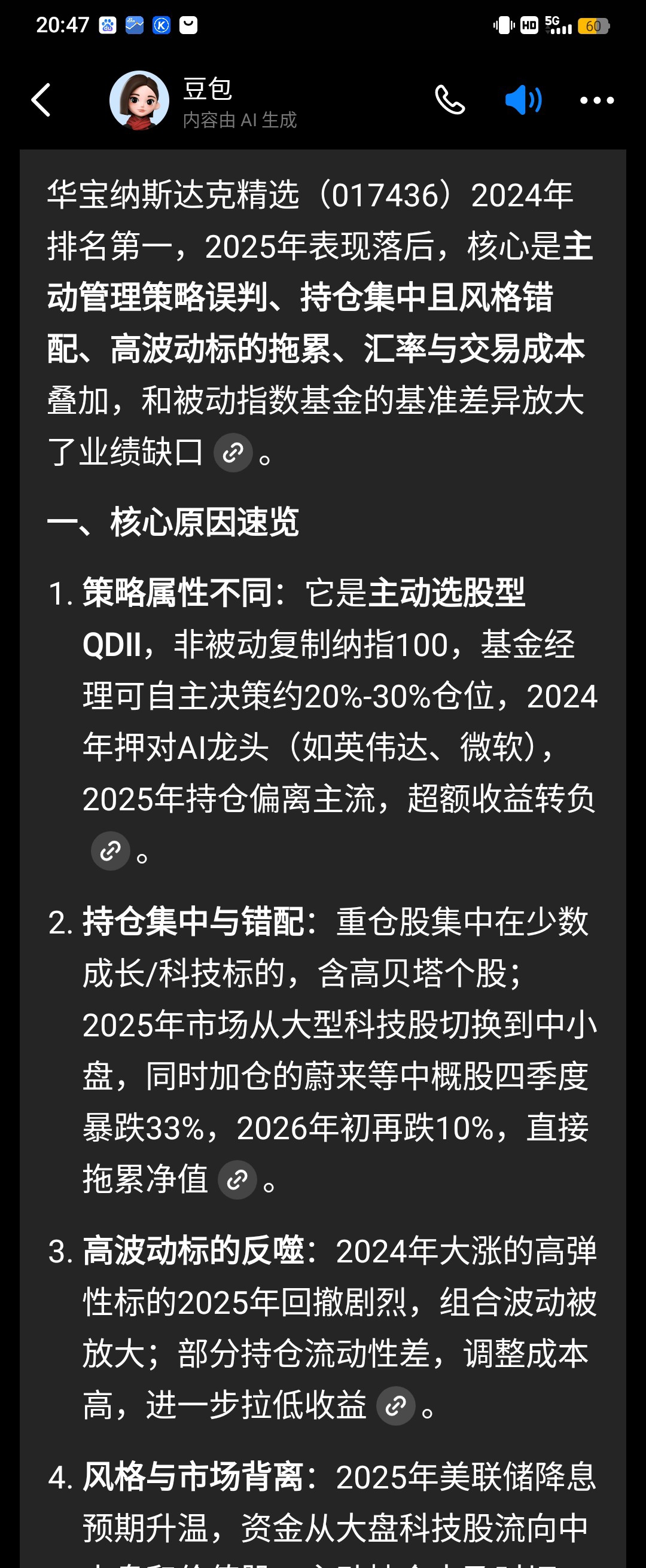 $华宝纳斯达克精选股票发起式(QDII(OTCFUND|017436)$ 这基为什么大大落后于指数和同类?据豆包分析,1. 持仓集中与错配:重仓股集中在少数成长/科技标的,含高贝塔个股;2025年市场从大型科技股切换到中小盘,同时加仓的蔚来等中概股四季度暴跌33%,2026年初再跌10%,直接拖累净值 。