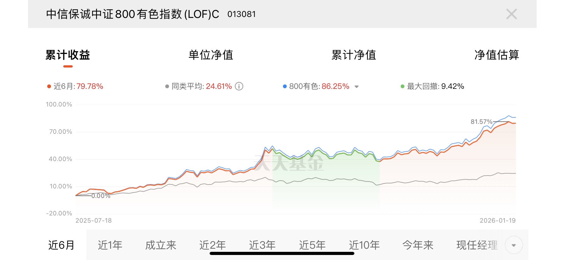 有色板块估值处于历史合理区间,回调后更具吸引力。中信保诚中证 800 有色指数 (LOF) C 近 6 月涨 79.78%,回调加仓,性价比凸显。