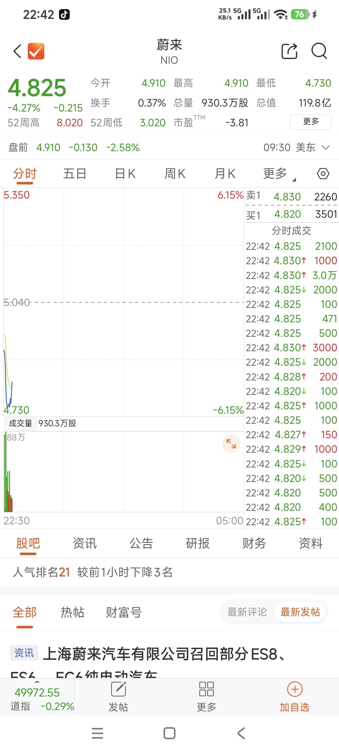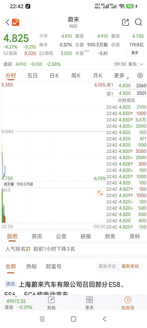 你第11重仓的蔚来宝贝跌4个点,看目前持仓,明天是绿的