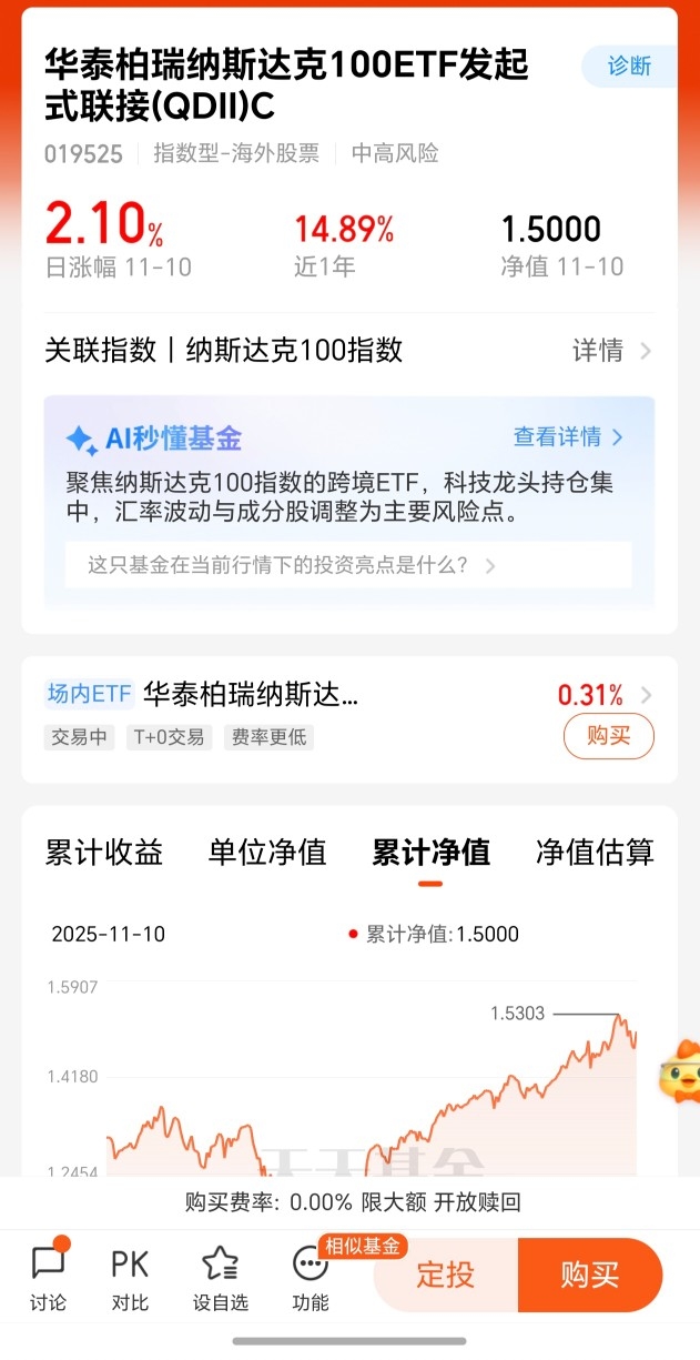 身边好多朋友都在吐槽,今年A股太难做了,反复横跳不说,还总让人猜不透方向,投着投着就没信心了。这时候我就想着把目光放远点儿,美股的长期稳健性确实让人羡慕,尤其是纳斯达克背后的一堆科技巨头,基本面摆在那儿。今天纳指100虽然小跌0.31%,但标普500还微涨0.21%,市场整体不算弱,这种分化行情下,指数基金反而更稳妥。对比了好几家的纳指相关产品,还是华泰柏瑞的更合心意,单日500的买入额度太够用了,不管是想定投还是逢低加仓都很方便,不用因为额度不够错过机会。对于想平衡 portfolio 风险的朋友,这款真可以重点看看,毕竟分散投资才是长久之道。$华泰柏瑞纳斯达克100ETF发起式联接(QDII)C$ #科技小登大揭秘#
