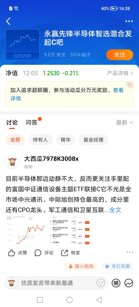 近期华宝纳斯达克精选C一直没动静,就把注意力多分了点给手里配的富国中证通信设备主题ETF联接C——它押中中兴通讯、中际旭创,还是全市场这两只股拿得最多的;成分里不光有CPO龙头,还搭上军工通信和卫星互联网,双线逻辑挺扎实。近1个月涨8%、近6个月92%,今天基金预估大涨,在同类里面领先。这季度成分公司嬴利环比大增11%,估值也比过去五年28%的时间都低,恢复速度也快,最差时55天就收复失地。今天基金预估大涨,在同类里面领先,配置上心里稳当不少。