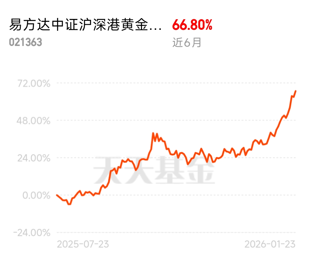 黄金价格一路高歌猛进,突破 5000 美元大关后涨势不停,$易方达中证沪深港黄金产业股票指数发起式C$ 表现超给力,近 6 月 66.80% 的涨幅,轻松跟上黄金产业的红利行情