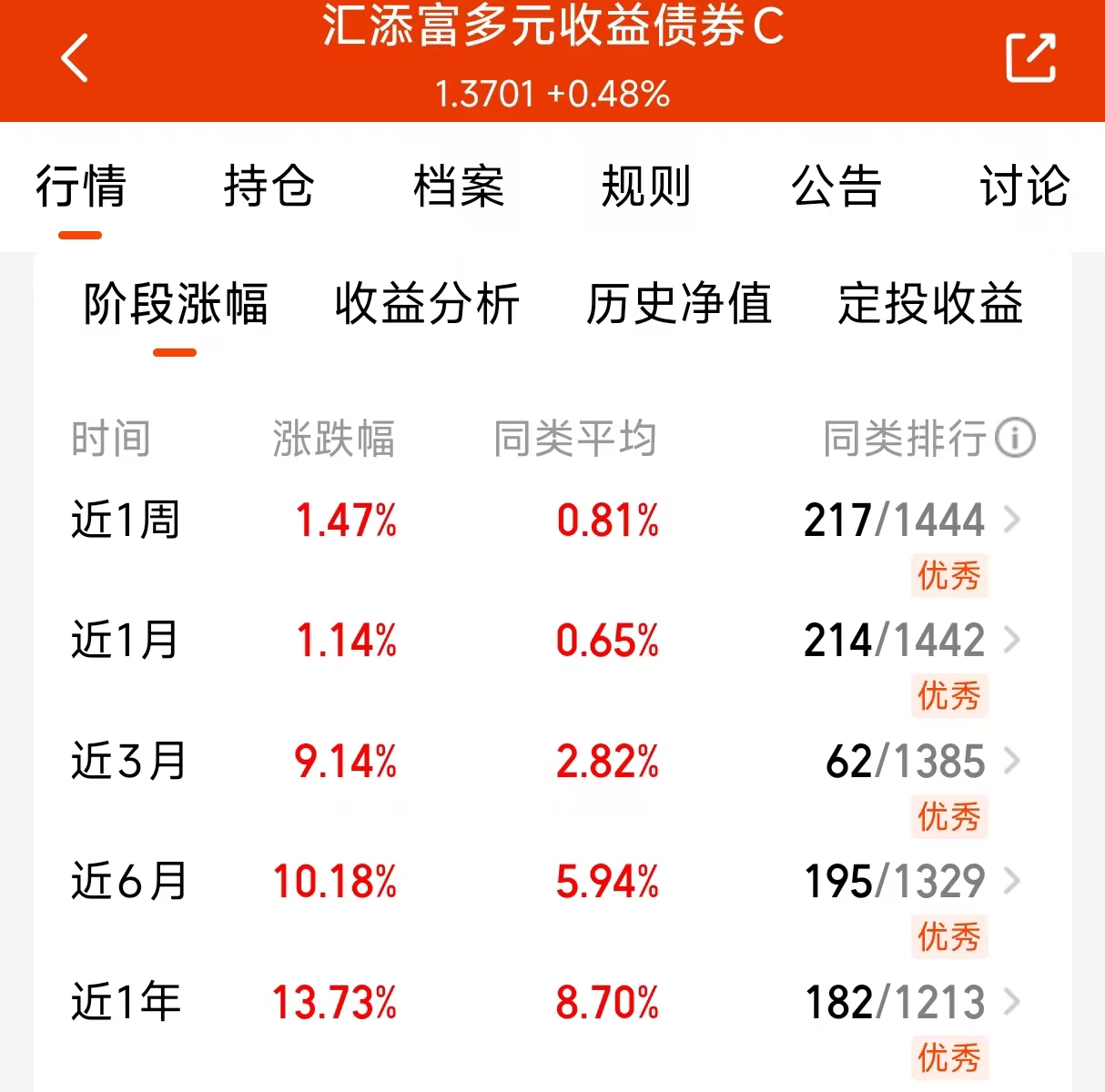 有些朋友吐槽今年债基收益还不如货币基金,纯债基金确实挺难,但“固收+”可不是一回事!比如$汇添富多元收益债券C$(470011),今年以来涨了11.06%,跑赢了92%的同类产品,收益跟中邮纯债恒利债券C(002277)差不多,但波动要小30%,性价比明显更高。汇添富多元收益的债券部分主要配高等级信用债和利率债,权益部分则紧盯科技成长板块,吃到了这波AI创新的红利。相比那些热门债基近半年还是负收益,这只基金靠着“债基打底+科创增强”的策略,不仅没掉队,反而创新高。我现在拿四成仓位放着,晚上不用盯外围市场,白天不用焦虑,真正实现了“躺平收蛋”。#飞天茅台批发价跌破1700!酒价何时触底?#