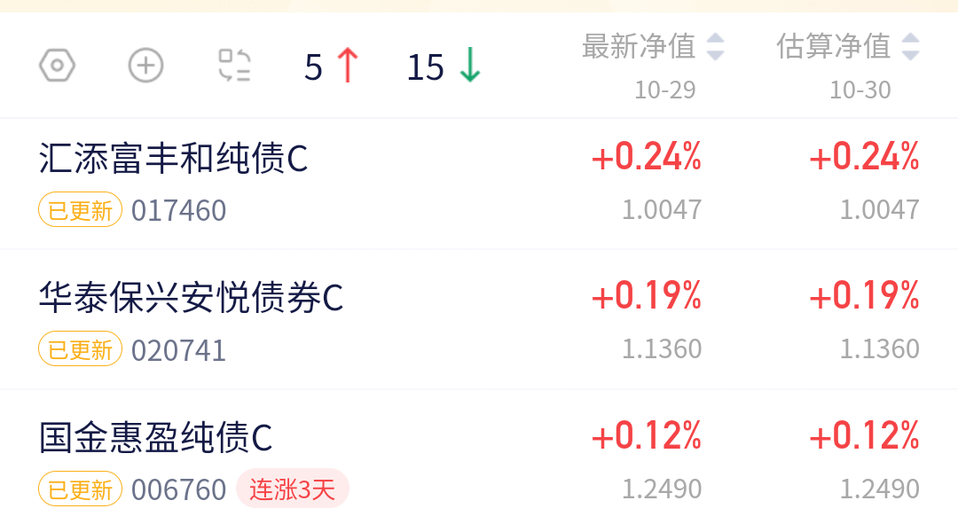 伙伴们,今天股市行情震荡,债市收蛋情况稳定。国债期货仅2年期收跌,其他收涨,利率债信用债延续收蛋。$汇添富丰和纯债C(OTCFUND|017460)$是30年超长债波段利器,久期恒定,今天收蛋24个
