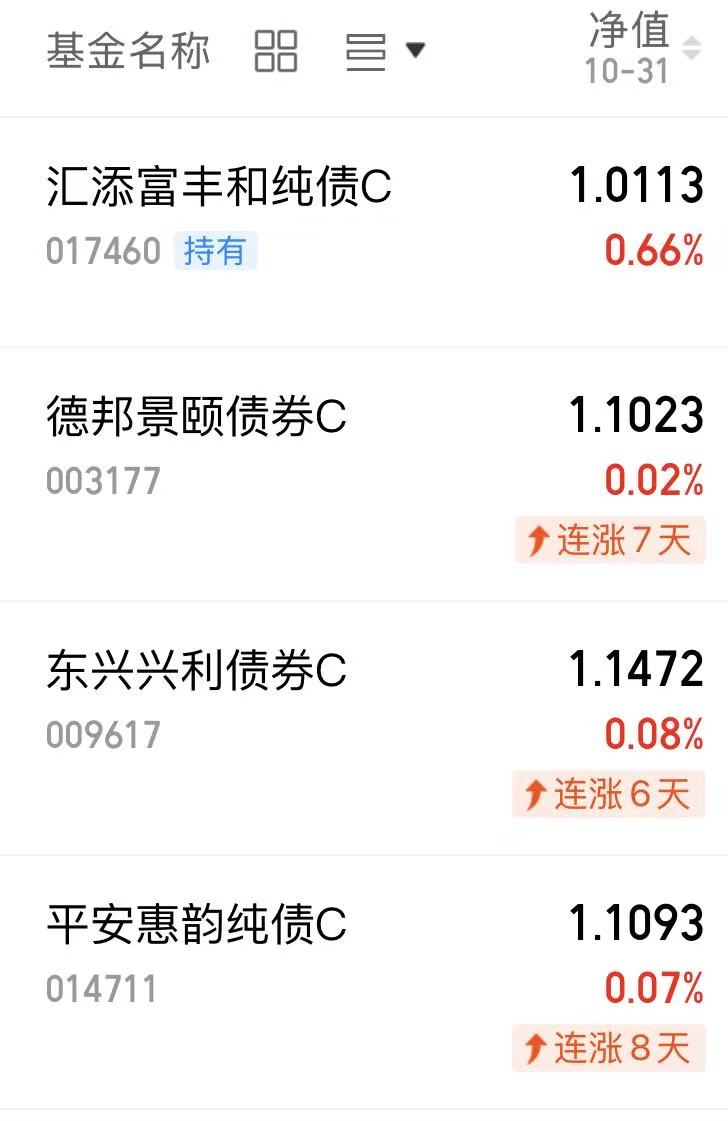 今天债市反弹啦,盘面给力呀,信用债和利率债都大涨,30年期国债期货上行0.42%,连续回暖了,看来也该轮动回来债市了,我的债基也继续持仓待涨啦,看看今天收蛋情况: