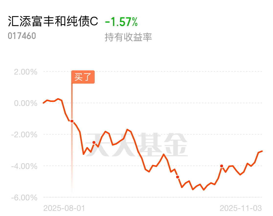 今天利率债算是峰回路转了!重仓30年国债的汇添富丰和纯债C产蛋了9个,近1月涨了2.36%,弹性还是很高的。经历多次低位补仓,持仓成本相对较低,距离翻红已经不算远了。后续有闲钱的话,个人再考虑加一些。